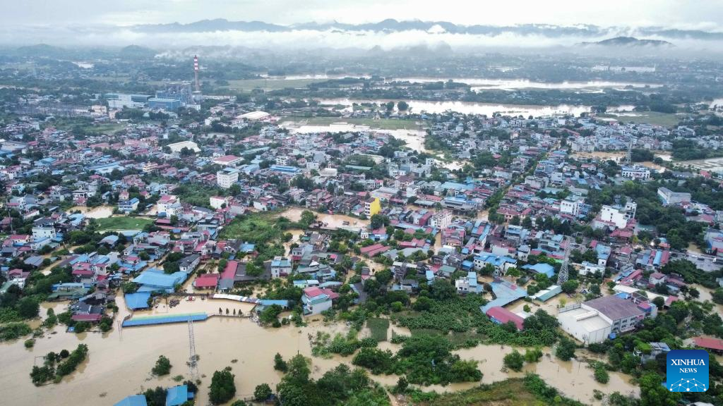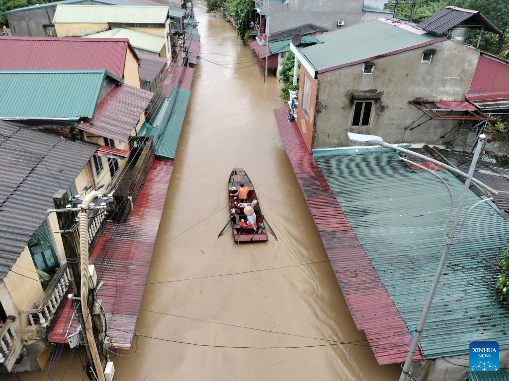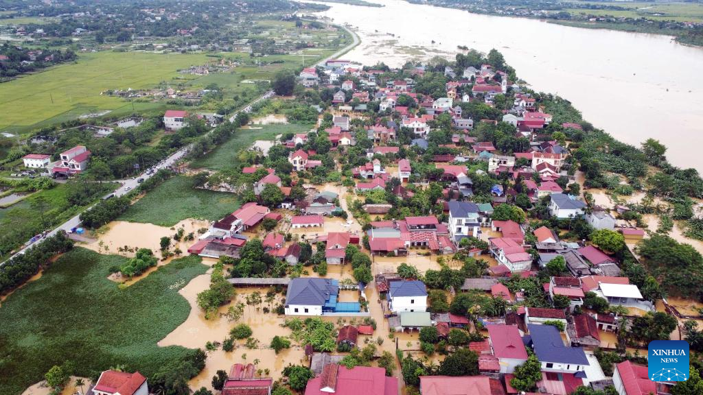 The rising river floods a large number of houses along the bank in Phu Tho province, Vietnam, Sept. 10, 2024. As of Wednesday morning, Typhoon Yagi and the consequent landslides and floods had left 141 dead and 59 missing in Vietnam's northern region, the Ministry of Agriculture and Rural Development announced. (VNA via Xinhua)