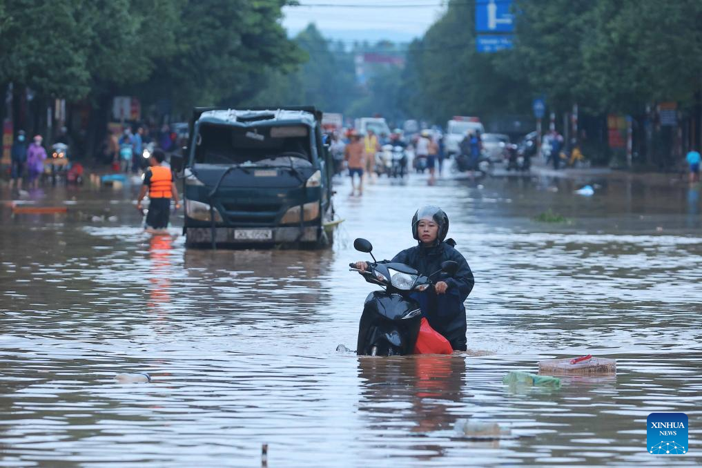 People wade through flood water on a street in Thai Nguyen City, Thai Nguyen province, Vietnam, Sept. 11, 2024. As of Wednesday morning, Typhoon Yagi and the consequent landslides and floods had left 141 dead and 59 missing in Vietnam's northern region, the Ministry of Agriculture and Rural Development announced. (VNA via Xinhua)