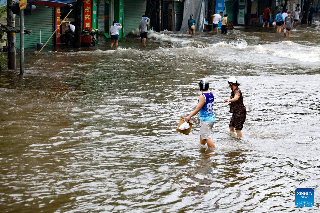 People wades through flood water on the street in Vietnam's capital Hanoi, Sept. 10, 2024. As of Wednesday morning, Typhoon Yagi and the consequent landslides and floods had left 141 dead and 59 missing in Vietnam's northern region, the Ministry of Agriculture and Rural Development announced. (VNA via Xinhua)