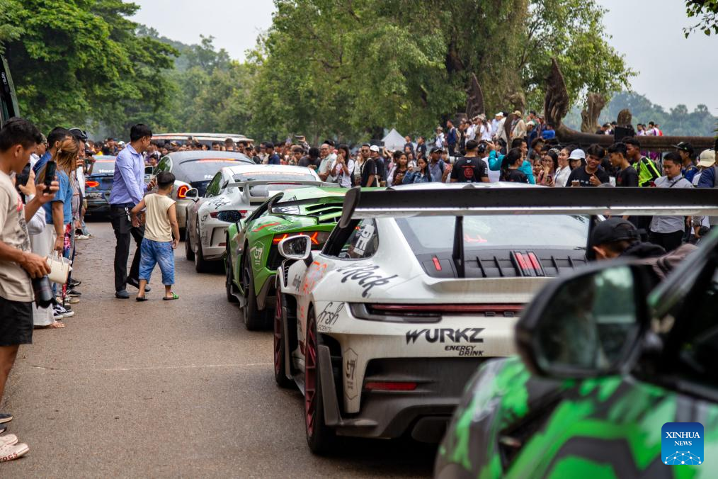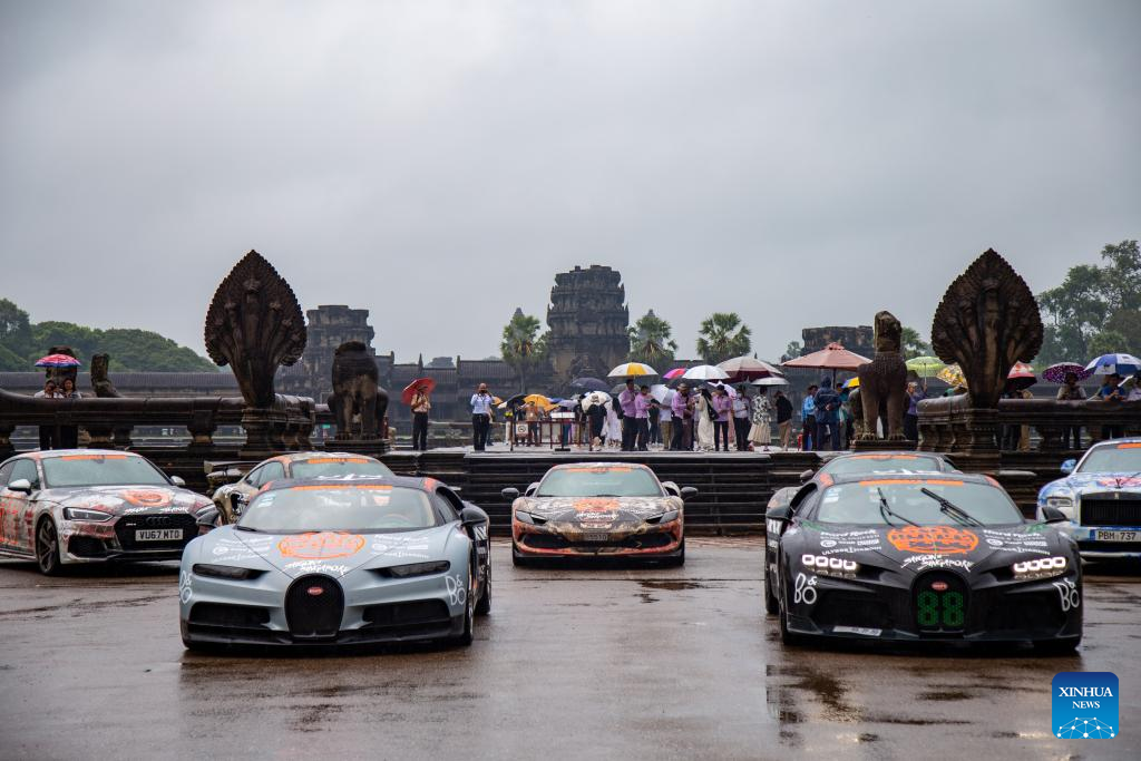 Luxury cars are displayed at the complex of the Angkor Archaeological Park in northwest Cambodia on Sept. 17, 2024. More than 100 luxury cars taking part in a car rally gathered in front of the Angkor Wat temple, with the aim of showcasing the UNESCO-listed world heritage site to the world.(Photo by Sao Khuth/Xinhua)