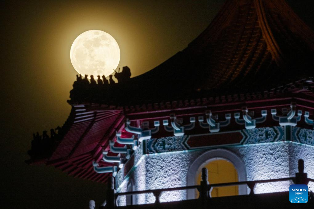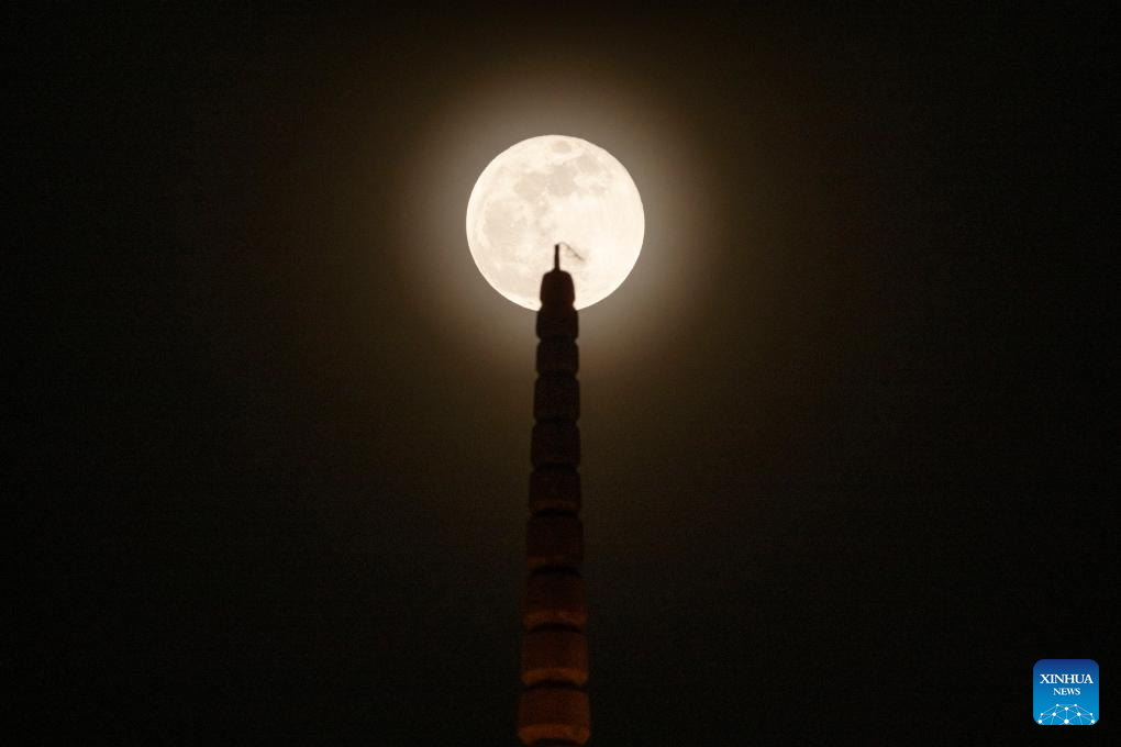 A supermoon rises above the Cloud Pagoda in Jurong Lake Gardens, Singapore, Sept. 18, 2024. (Photo by Then Chih Wey/Xinhua)