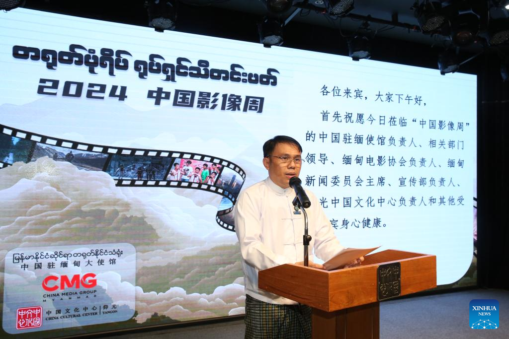 U Zeyar, deputy director general of the media development department under Myanmar's Ministry of Information, delivers a speech at the 2024 China Film Week at the China Cultural Center in Yangon, Myanmar, Sept. 20, 2024. The 2024 China Film Week commenced in Yangon, Myanmar on Friday, with more than 100 representatives from Myanmar's film, literature, education and media sectors as well as overseas Chinese communities attending the event. (Xinhua/Myo Kyaw Soe)