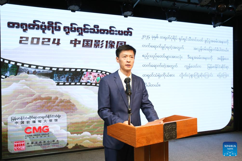 Zheng Zhihong, minister counselor of the Chinese embassy in Myanmar, delivers a speech at the 2024 China Film Week at the China Cultural Center in Yangon, Myanmar, Sept. 20, 2024. The 2024 China Film Week commenced in Yangon, Myanmar on Friday, with more than 100 representatives from Myanmar's film, literature, education and media sectors as well as overseas Chinese communities attending the event. (Xinhua/Myo Kyaw Soe)
