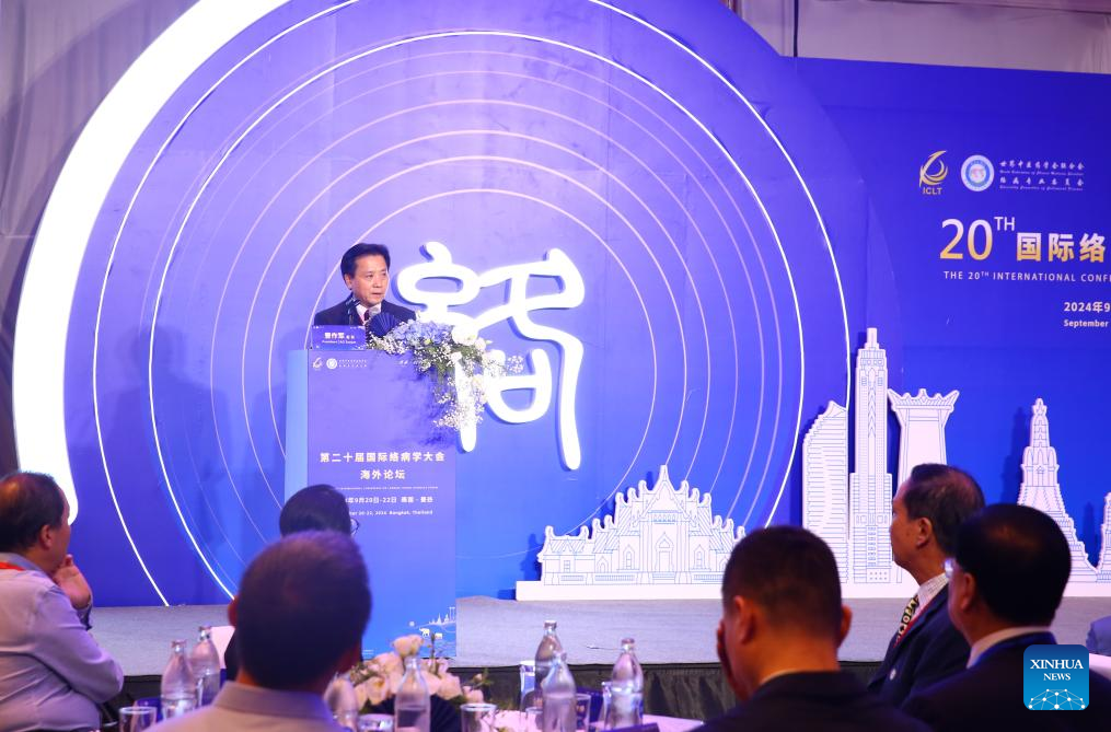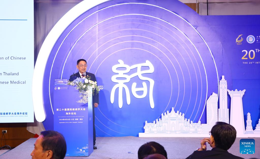 Lin Danqian, president of Traditional Chinese Medicine Doctor Association Thailand, speaks at the 20th International Conference on Luobing Theory Overseas Forum in Bangkok, Thailand, Sept. 21, 2024.Experts and scholars from 13 countries and regions have gathered in Bangkok to share the latest research results of Luobing theory or the theory of collateral diseases, aiming to promote the high-quality development of Traditional Chinese Medicine (TCM) and accelerate its globalization. (Xinhua/Sun Weitong)