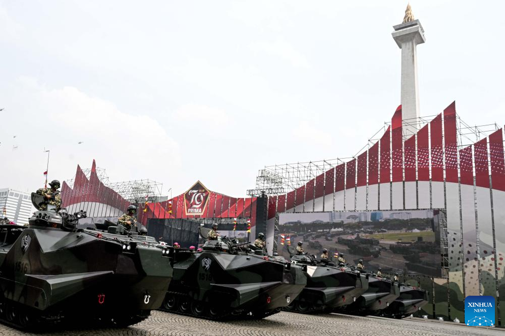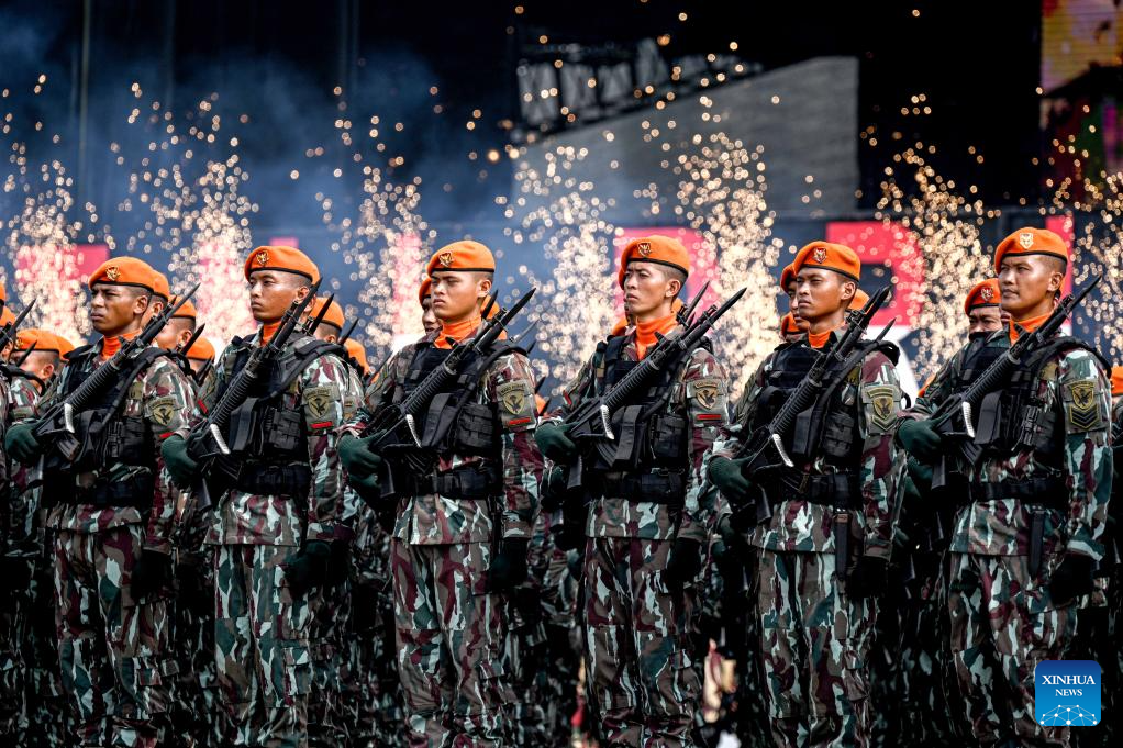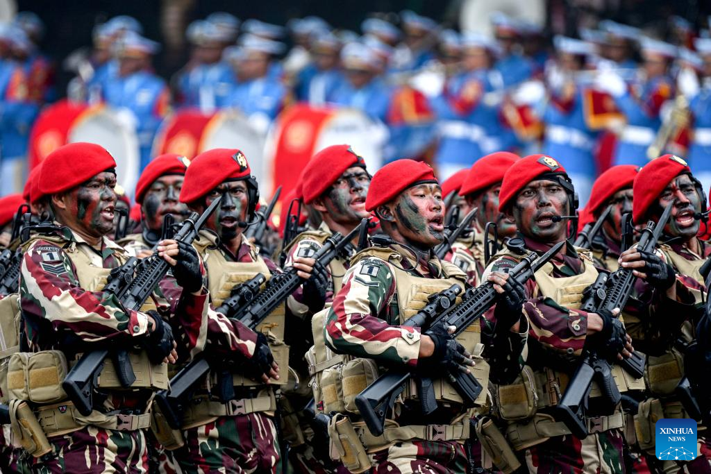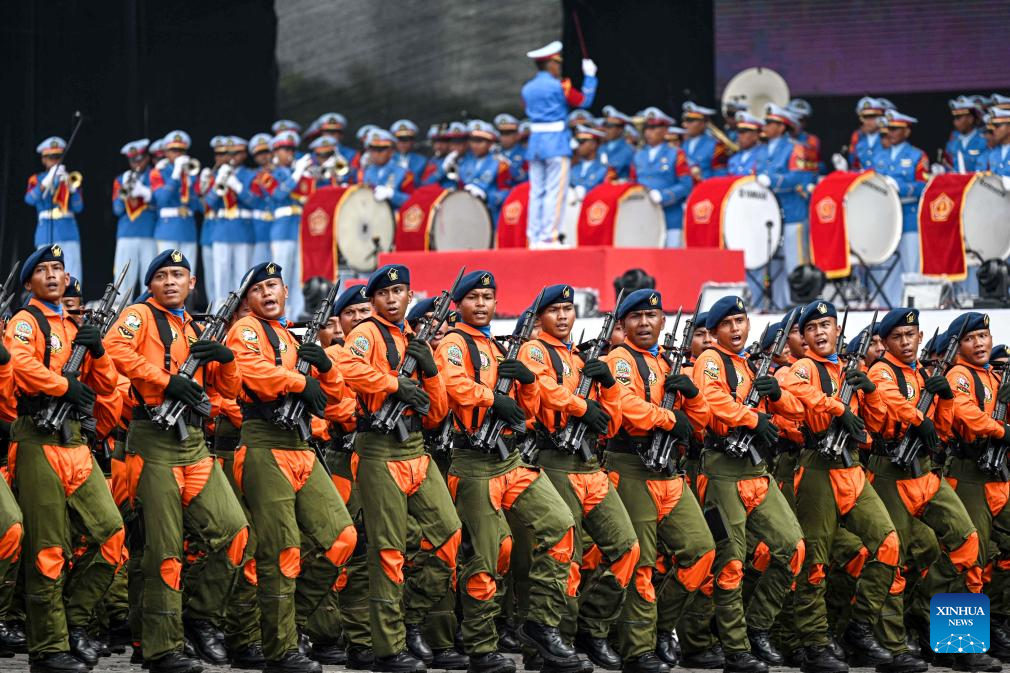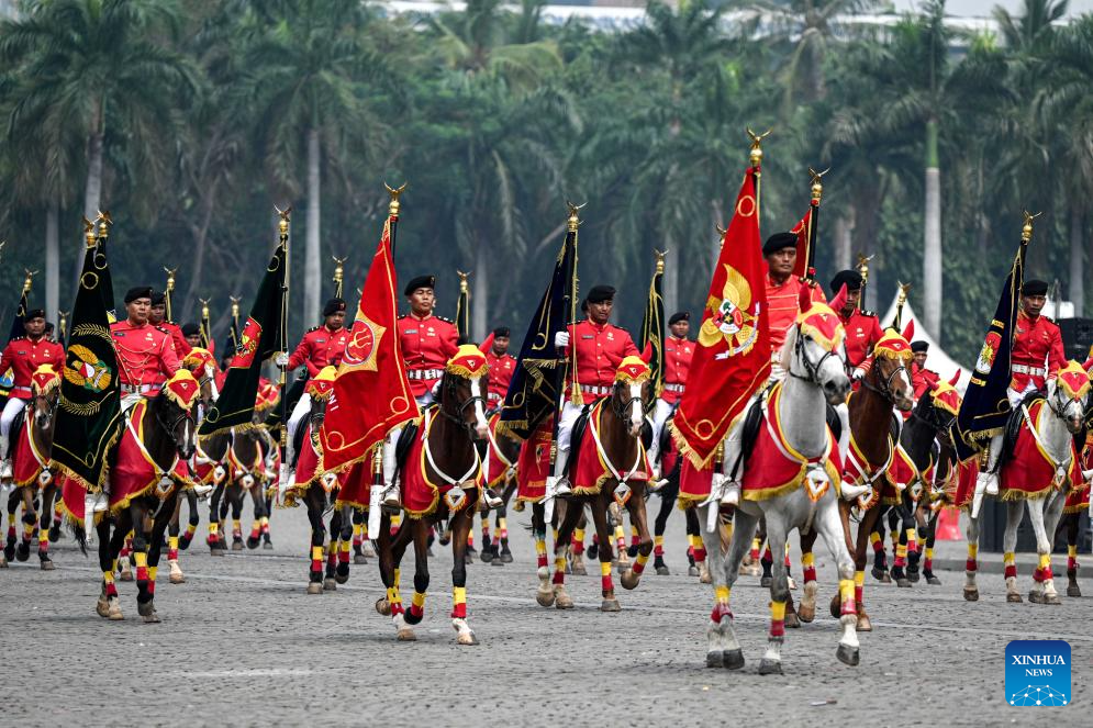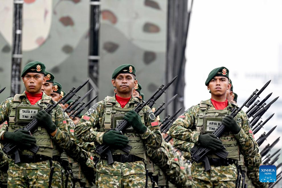 The Indonesian National Army (TNI) participate in a military parade rehearsal of the 79th anniversary of the TNI at Monument National in Jakarta, Indonesia, on Oct. 3, 2024. The TNI will showcase over 1,000 military assets from the Army, Navy, and Air Force during its 79th anniversary celebrations on Oct. 5. (Xinhua/Agung Kuncahya B.)
