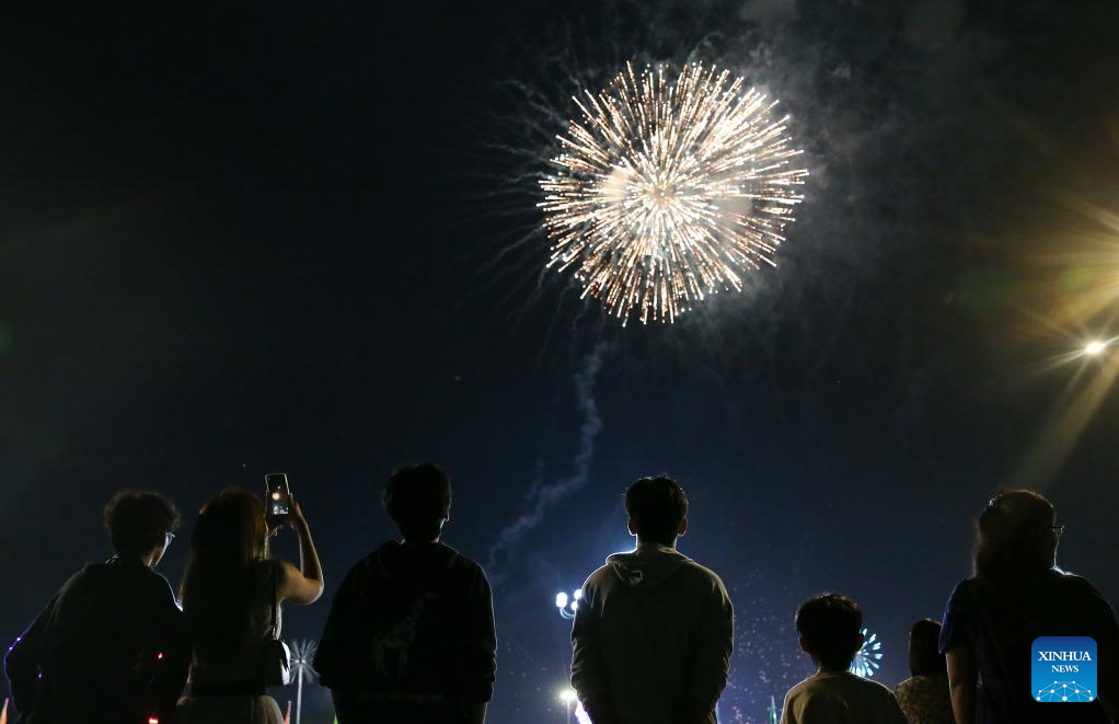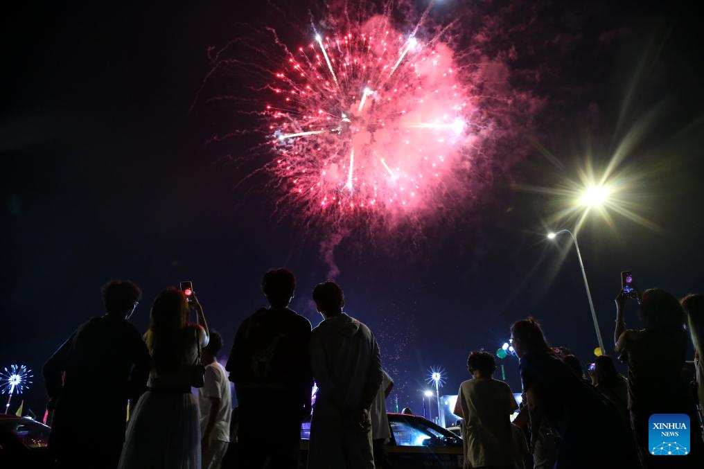 People watch a fireworks show during the Thadingyut Festival in Yangon, Myanmar, Oct. 17, 2024. The Thadingyut Festival, known as the lighting festival, is traditionally celebrated for three days. (Xinhua/Myo Kyaw Soe)