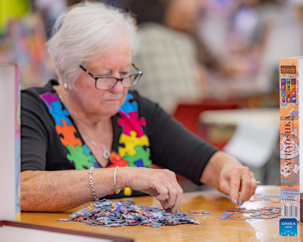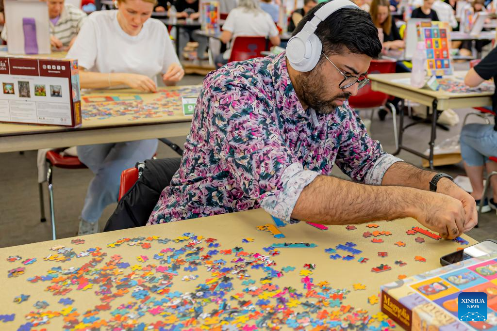 A competitor competes in the Australian Capital Territory (ACT) State Jigsaw Puzzle Competition in Canberra, Australia, Oct. 19, 2024. The first ACT State Jigsaw Puzzle Competition was held in Canberra by the Australian Jigsaw Puzzle Association on Saturday. (Photo by Chu Chen/Xinhua)