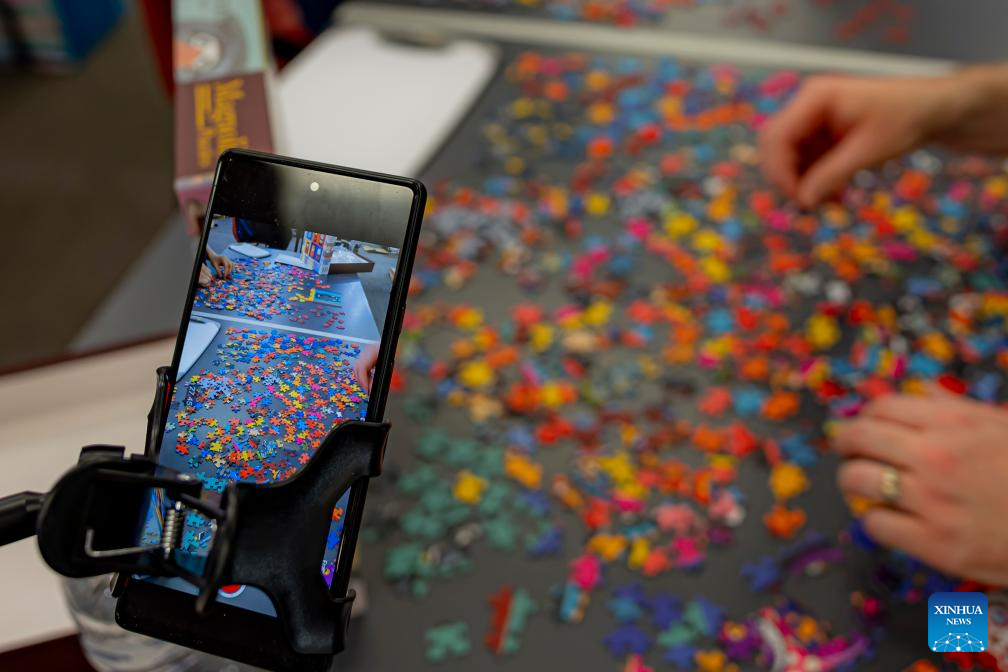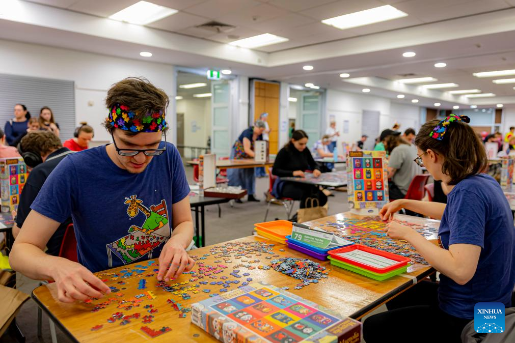 Competitors compete in the Australian Capital Territory (ACT) State Jigsaw Puzzle Competition in Canberra, Australia, Oct. 19, 2024. The first ACT State Jigsaw Puzzle Competition was held in Canberra by the Australian Jigsaw Puzzle Association on Saturday. (Photo by Chu Chen/Xinhua)