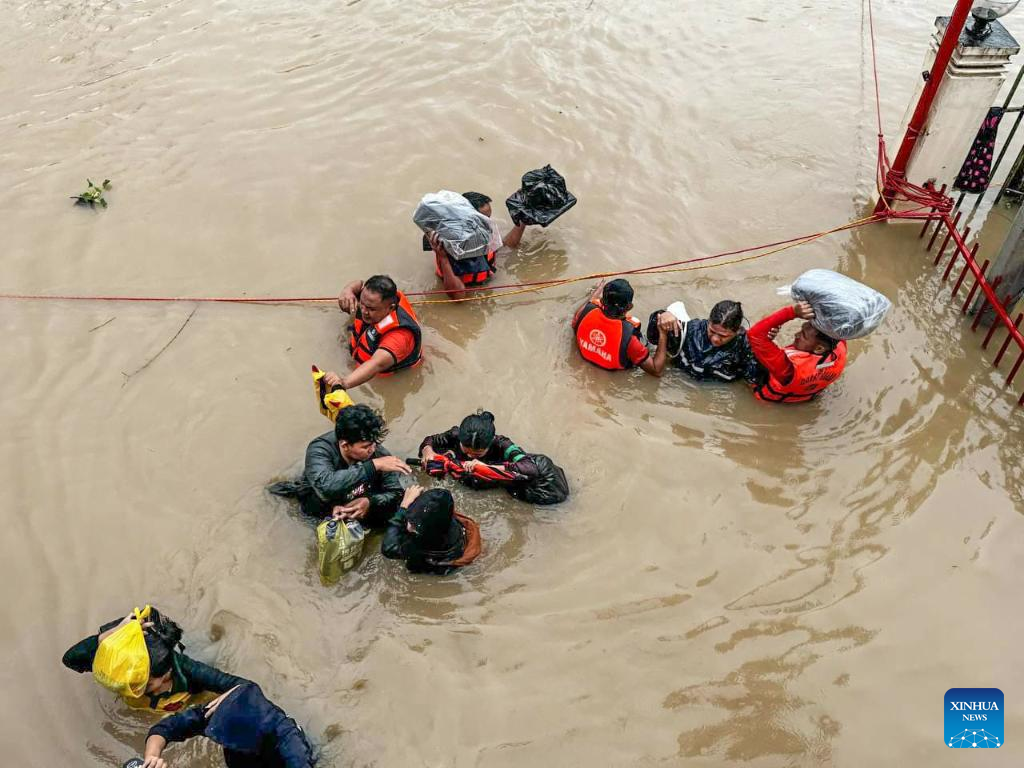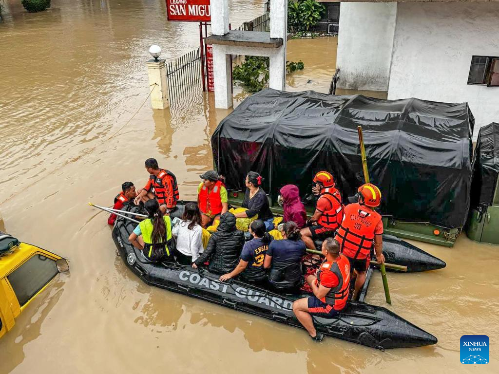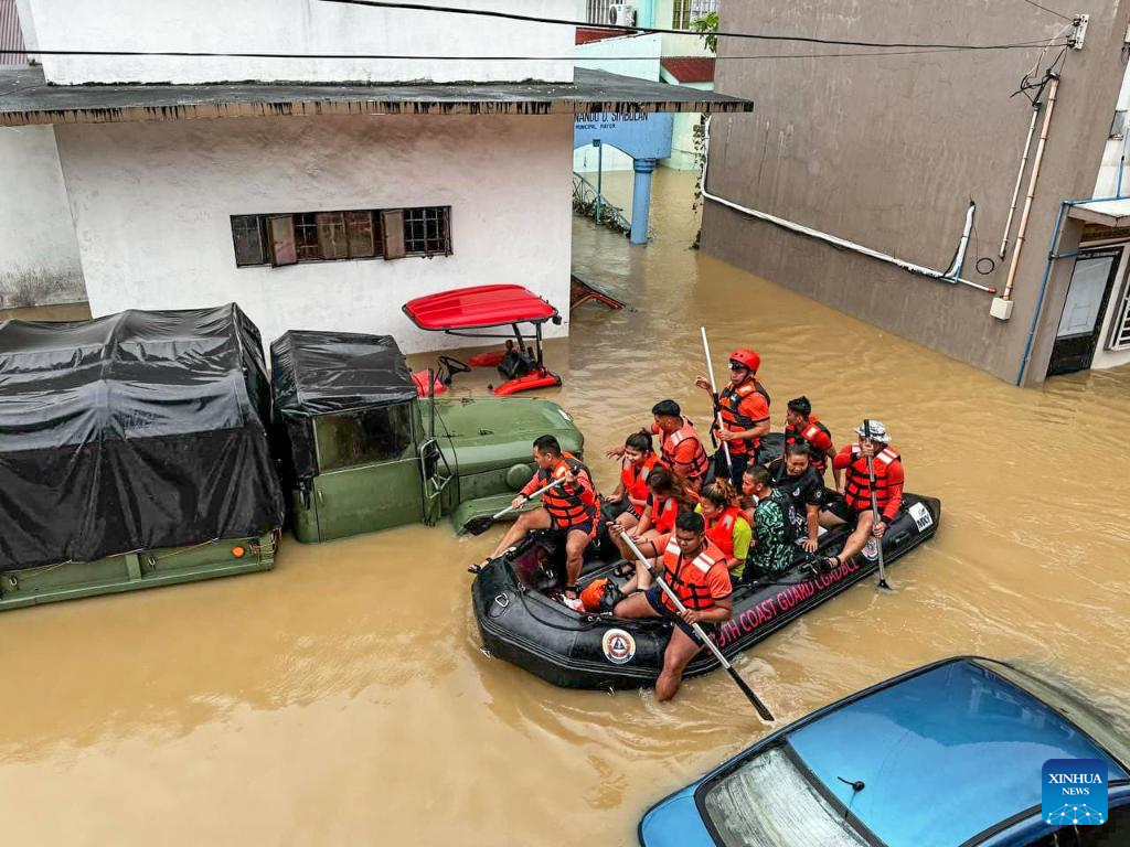 Rescuers evacuate residents from the floods caused by Tropical Storm Trami in Camarines Sur Province, the Philippines on Oct. 24, 2024. At least 22 people have been killed and nine others are missing due to massive flooding and landslides triggered by Tropical Storm Trami, which continues to rip through the Philippines on Thursday, authorities said. (Photo by Philippine Coast Guard/Xinhua)