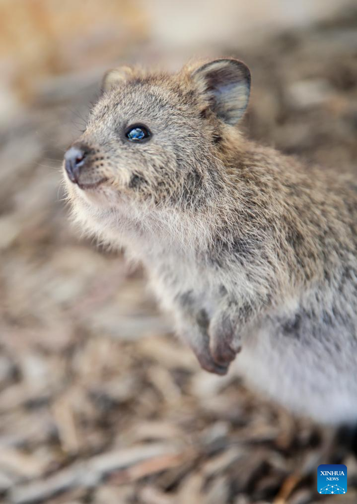 A quokka is seen on the Rottnest Island in Australia, Oct. 25, 2024. Often called "the happiest animal in the world", Quokkas are a small marsupial related to Kangaroos. They have grey-brown fur and small, rounded ears, feeding on fresh, young grasses, leaves and succulents, as well as plant roots.