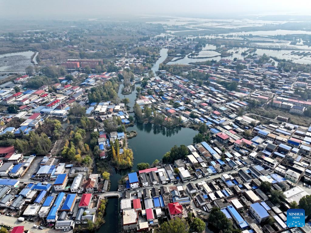 An aerial drone photo taken on Nov. 8, 2024 shows villages along Baiyangdian Lake in Xiong'an New Area, north China's Hebei Province. China's South-to-North Water Diversion Project has three routes. The middle route, which is the most prominent one, begins at the Danjiangkou Reservoir in central China's Hubei Province and runs through Henan and Hebei before reaching Beijing and Tianjin.