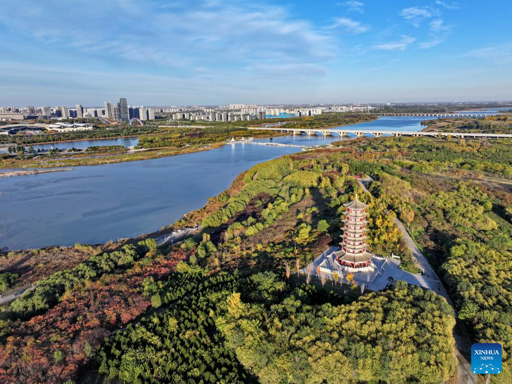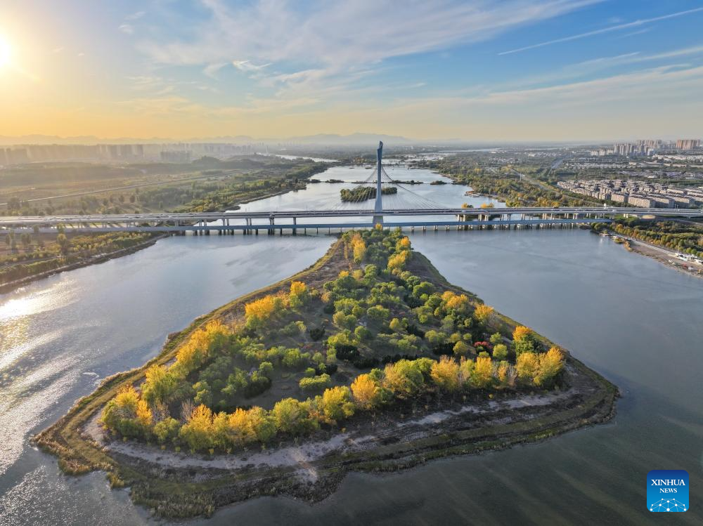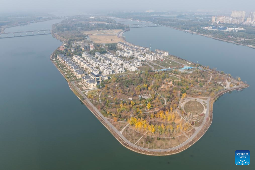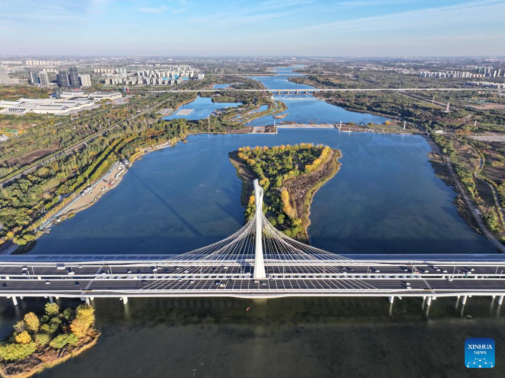 An aerial drone photo taken on Nov. 7, 2024 shows an island on Hutuo River in Shijiazhuang, north China's Hebei Province. China's South-to-North Water Diversion Project has three routes. The middle route, which is the most prominent one, begins at the Danjiangkou Reservoir in central China's Hubei Province and runs through Henan and Hebei before reaching Beijing and Tianjin.