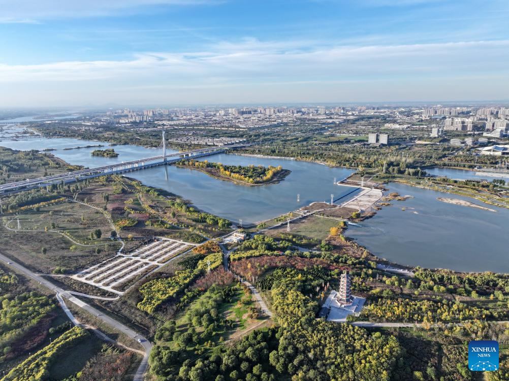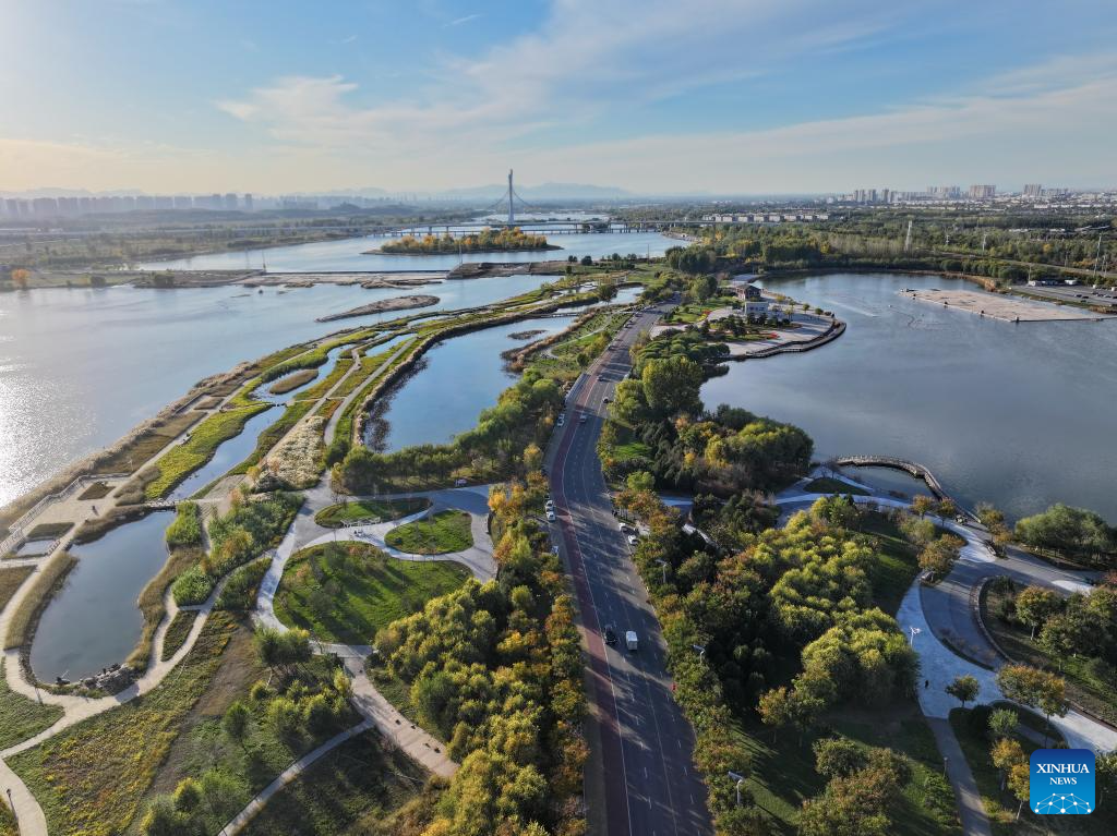 An aerial drone photo taken on Nov. 7, 2024 shows a view of Hutuo River in Shijiazhuang, north China's Hebei Province. China's South-to-North Water Diversion Project has three routes. The middle route, which is the most prominent one, begins at the Danjiangkou Reservoir in central China's Hubei Province and runs through Henan and Hebei before reaching Beijing and Tianjin.