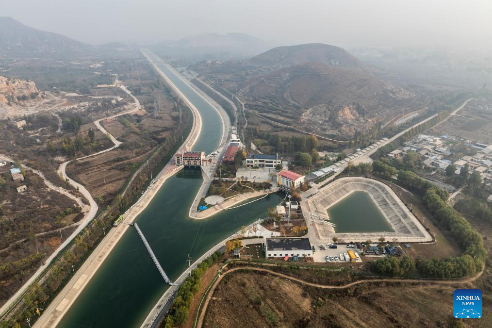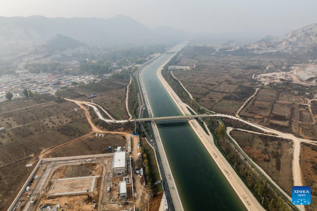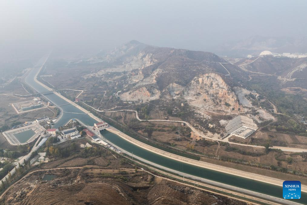 An aerial drone photo taken on Nov. 8, 2024 shows the Xiheishan section on the middle route of China's South-to-North Water Diversion Project in Baoding, north China's Hebei Province. China's South-to-North Water Diversion Project has three routes. The middle route, which is the most prominent one, begins at the Danjiangkou Reservoir in central China's Hubei Province and runs through Henan and Hebei before reaching Beijing and Tianjin.