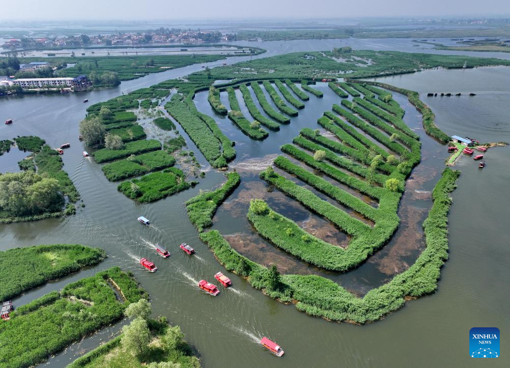 An aerial drone photo taken on May 8, 2024 shows boats touring Baiyangdian Lake in Xiong'an New Area, north China's Hebei Province. China's South-to-North Water Diversion Project has three routes. The middle route, which is the most prominent one, begins at the Danjiangkou Reservoir in central China's Hubei Province and runs through Henan and Hebei before reaching Beijing and Tianjin.
