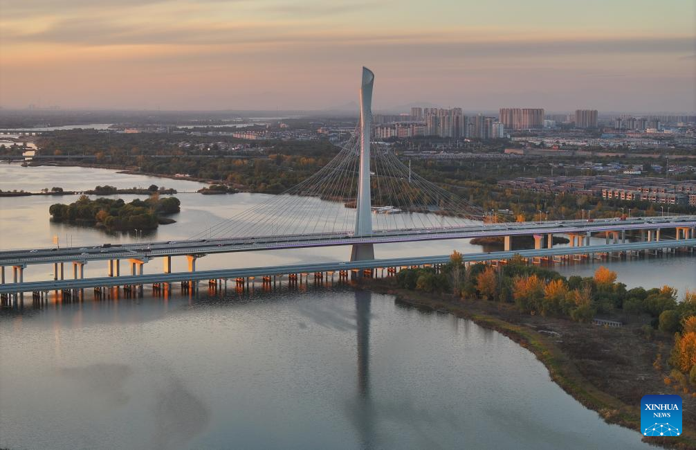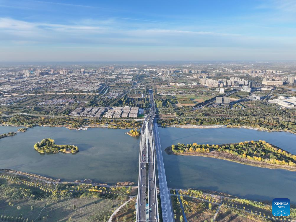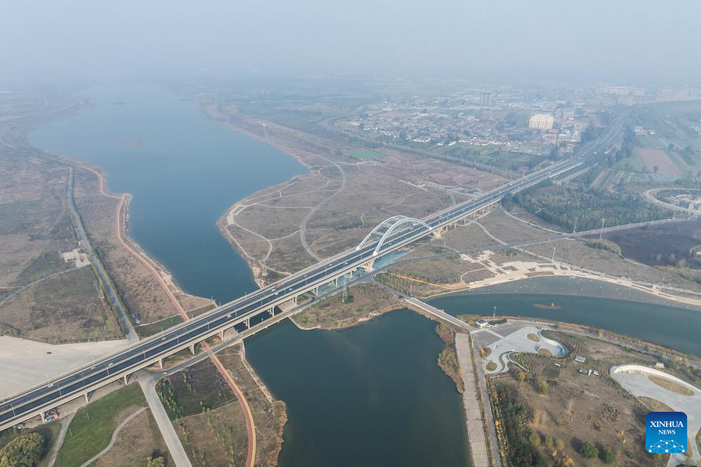 An aerial drone photo taken on Nov. 4, 2024 shows Hutuo River grand bridge in Shijiazhuang, north China's Hebei Province. China's South-to-North Water Diversion Project has three routes. The middle route, which is the most prominent one, begins at the Danjiangkou Reservoir in central China's Hubei Province and runs through Henan and Hebei before reaching Beijing and Tianjin.