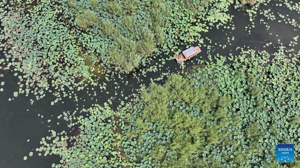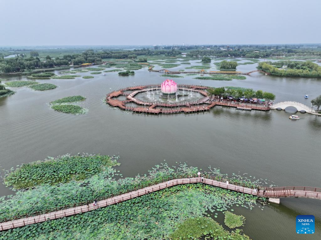 A drone photo taken on July 9, 2024 shows a lotus-themed park in Baiyangdian Lake in Xiong'an New Area, north China's Hebei Province. China's South-to-North Water Diversion Project has three routes. The middle route, which is the most prominent one, begins at the Danjiangkou Reservoir in central China's Hubei Province and runs through Henan and Hebei before reaching Beijing and Tianjin.