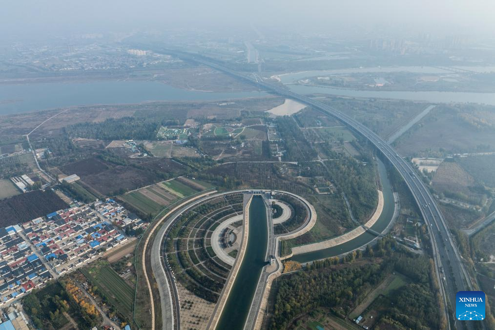An aerial drone photo taken on Nov. 7, 2024 shows the Hutuo River inverted siphon project on the middle route of China's South-to-North Water Diversion Project in Shijiazhuang, north China's Hebei Province. China's South-to-North Water Diversion Project has three routes. The middle route, which is the most prominent one, begins at the Danjiangkou Reservoir in central China's Hubei Province and runs through Henan and Hebei before reaching Beijing and Tianjin.