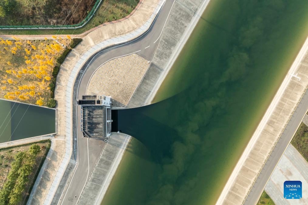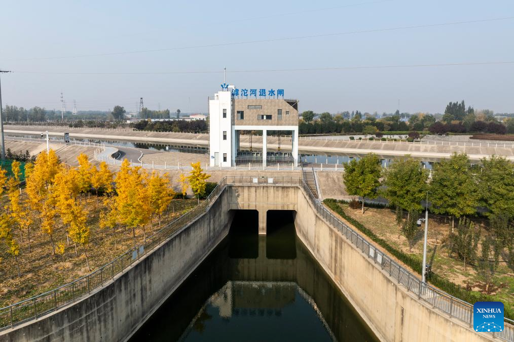 A drone photo taken on Nov. 7, 2024 shows a sluice of Hutuo River in Shijiazhuang, north China's Hebei Province. China's South-to-North Water Diversion Project has three routes. The middle route, which is the most prominent one, begins at the Danjiangkou Reservoir in central China's Hubei Province and runs through Henan and Hebei before reaching Beijing and Tianjin.