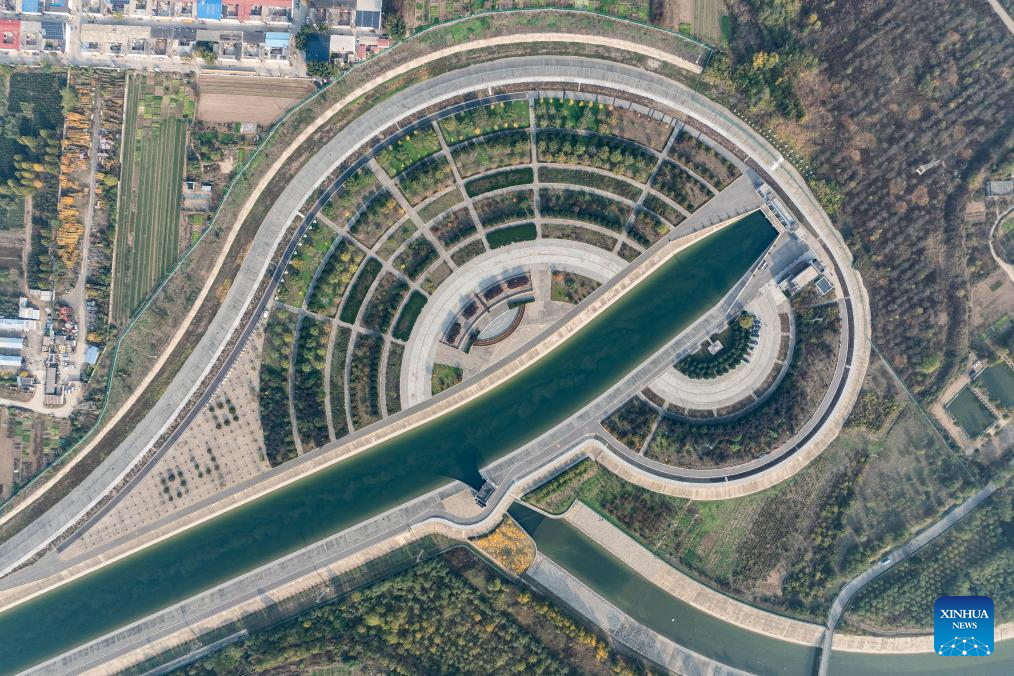 An aerial drone photo taken on Nov. 8, 2024 shows the Xiheishan sluice project on the middle route of China's South-to-North Water Diversion Project in Baoding, north China's Hebei Province. China's South-to-North Water Diversion Project has three routes. The middle route, which is the most prominent one, begins at the Danjiangkou Reservoir in central China's Hubei Province and runs through Henan and Hebei before reaching Beijing and Tianjin.