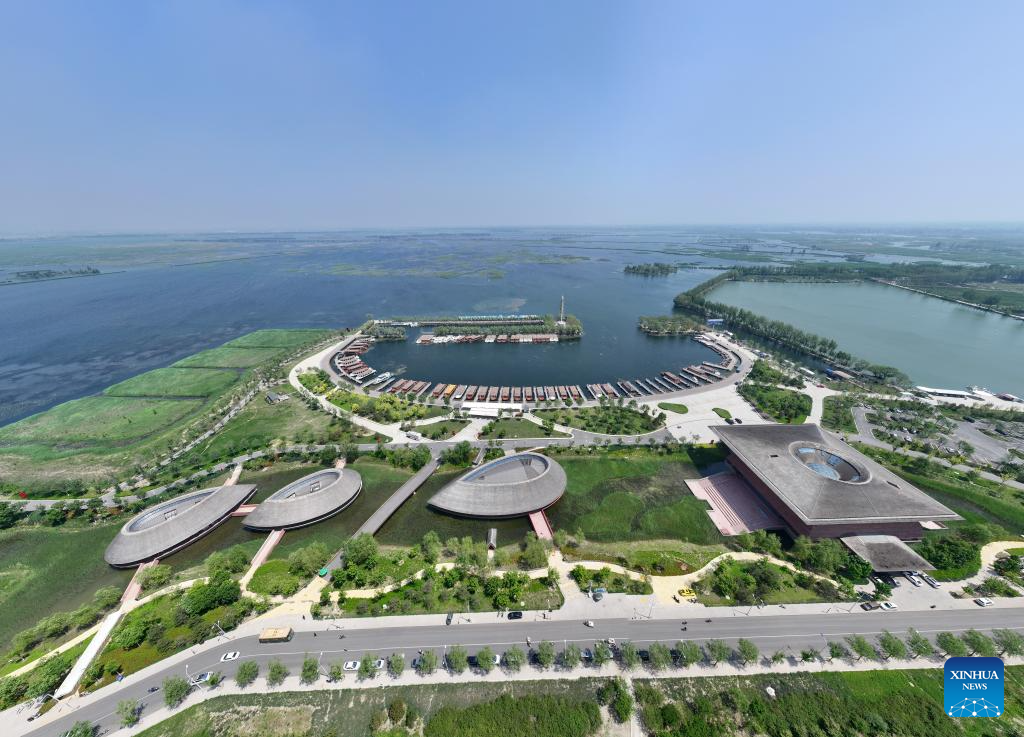 An aerial drone photo taken on May 8, 2024 shows a view of Baiyangdian tourism wharf in Xiong'an New Area, north China's Hebei Province. China's South-to-North Water Diversion Project has three routes. The middle route, which is the most prominent one, begins at the Danjiangkou Reservoir in central China's Hubei Province and runs through Henan and Hebei before reaching Beijing and Tianjin.