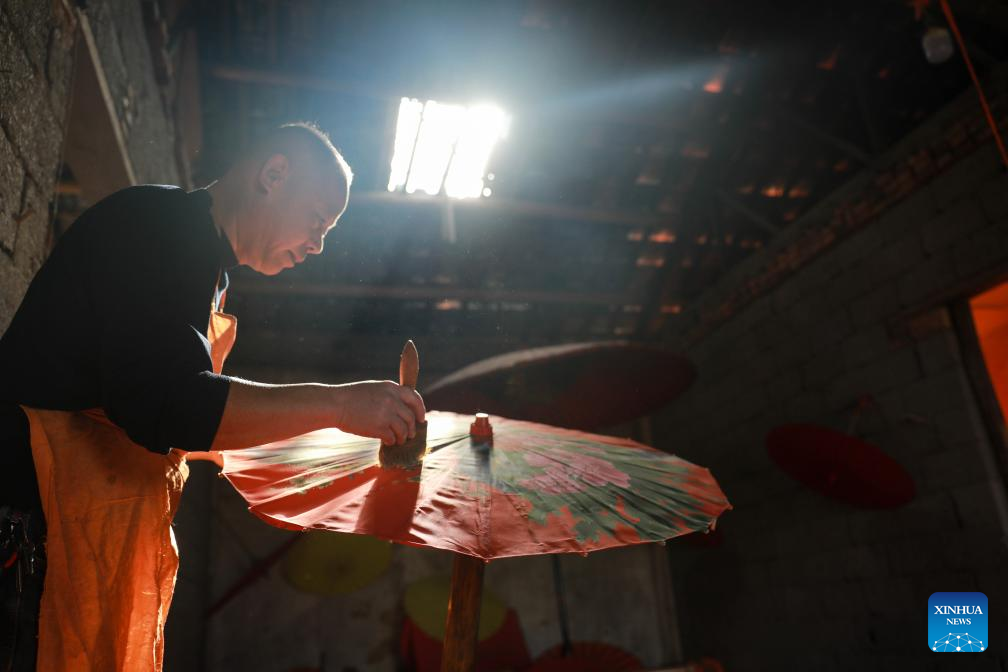 Zheng Guomin, a provincial-level inheritor of intangible cultural heritage, makes oilcloth umbrella at Guomin Oilcloth Umbrella Plant in Gufeng Village of Jingxian County, east China's Anhui Province, Nov. 13, 2024. The umbrella, made of oiled cloth and bamboo frame, is a traditional Chinese handicraft.