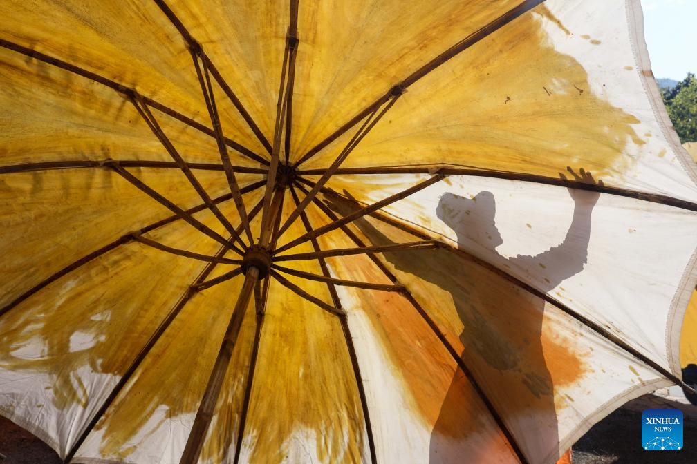 A worker airs oilcloth umbrellas in Gufeng Village of Jingxian County, east China's Anhui Province, Nov. 13, 2024. The umbrella, made of oiled cloth and bamboo frame, is a traditional Chinese handicraft.