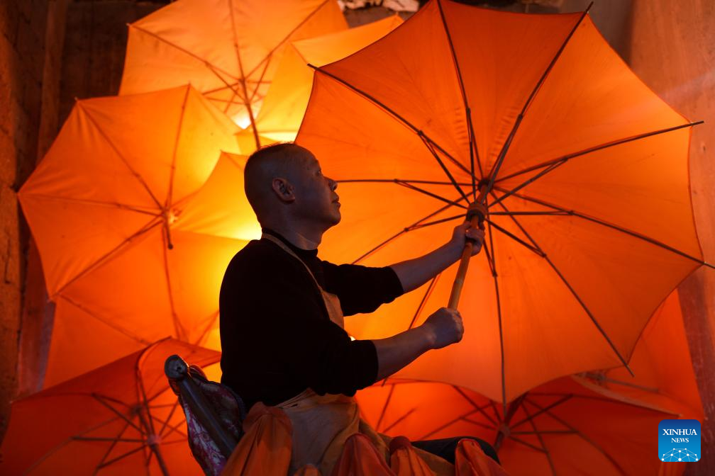 The oilcloth umbrella-making craftsmanship with 12 procedures is a provincial-level intangible cultural heritage. (Xinhua/Cao Li)