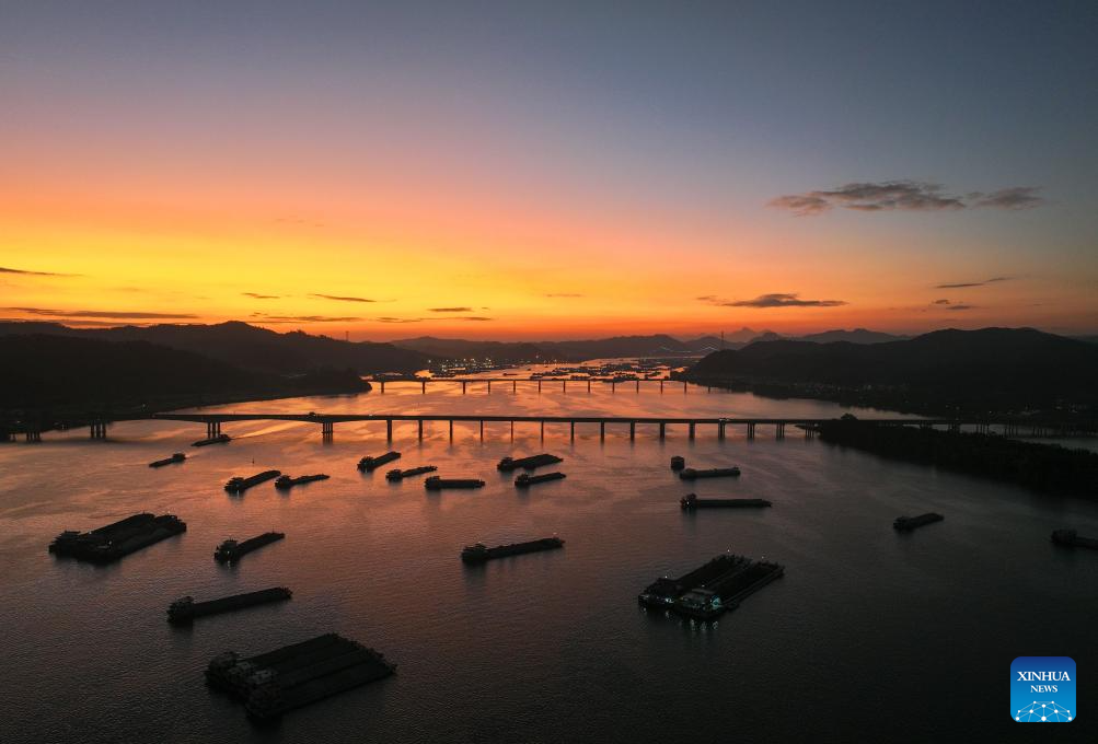 An aerial drone photo taken on Nov. 15, 2024 shows the scenery at sunset near Sizhou Village in Changzhou District of Wuzhou City, south China's Guangxi Zhuang Autonomous Region. Located on the Sizhou Island in Xijiang River and bestowed with rich intangible cultural heritage and beautiful natural scenery, Sizhou Village has become a famous tourism attraction.