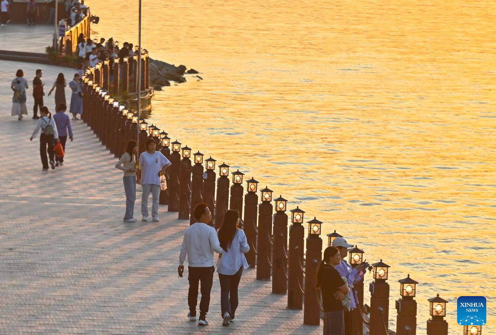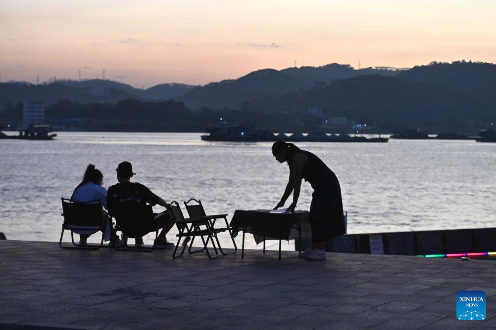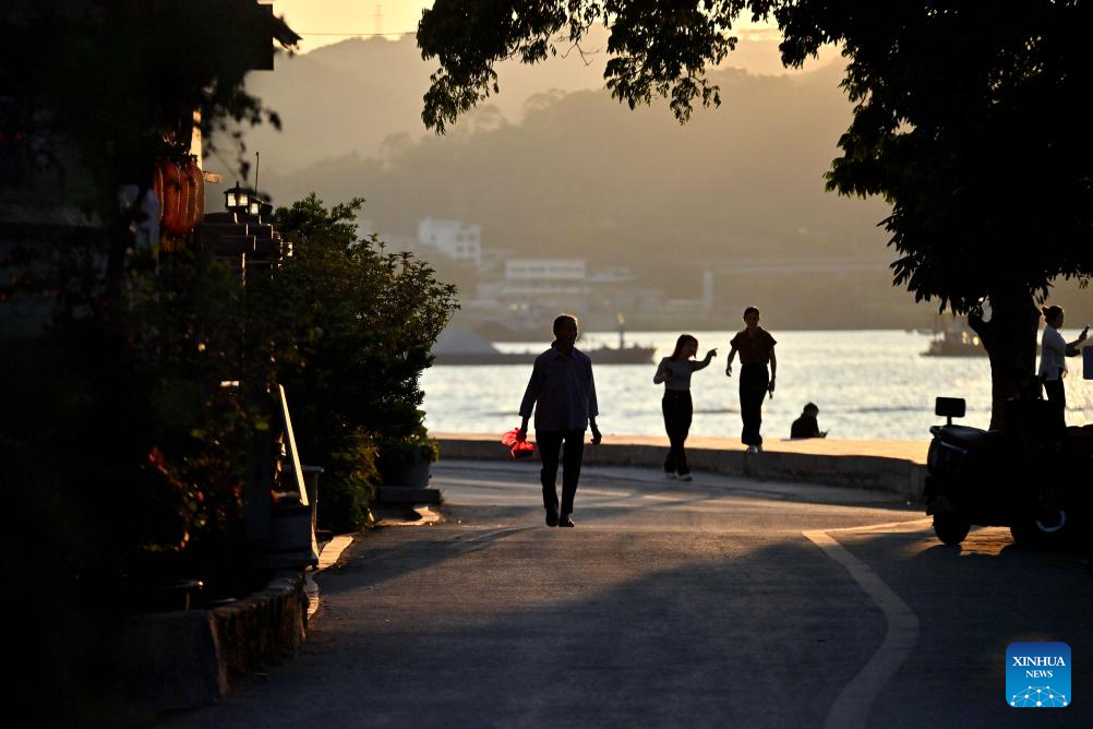 Tourists enjoy the sunset scenery at Sizhou Village in Changzhou District of Wuzhou City, south China's Guangxi Zhuang Autonomous Region, Nov. 12, 2024. Located on the Sizhou Island in Xijiang River and bestowed with rich intangible cultural heritage and beautiful natural scenery, Sizhou Village has become a famous tourism attraction.