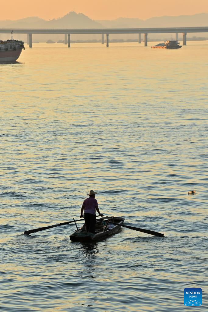 A villager rows a boat in the Xijiang River in Sizhou Village of Changzhou District in Wuzhou City, south China's Guangxi Zhuang Autonomous Region, Nov. 12, 2024. Located on the Sizhou Island in Xijiang River and bestowed with rich intangible cultural heritage and beautiful natural scenery, Sizhou Village has become a famous tourism attraction.