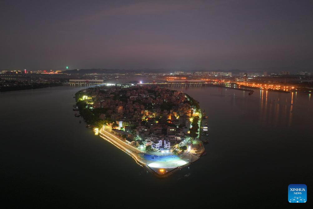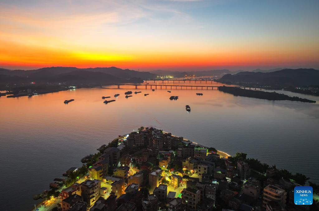 An aerial drone photo taken on Nov. 13, 2024 shows the scenery at sunset in Sizhou Village in Changzhou District of Wuzhou City, south China's Guangxi Zhuang Autonomous Region. Located on the Sizhou Island in Xijiang River and bestowed with rich intangible cultural heritage and beautiful natural scenery, Sizhou Village has become a famous tourism attraction.