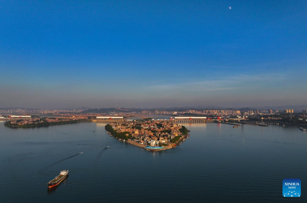 An aerial drone photo taken on Nov. 13, 2024 shows the scenery in Sizhou Village of Changzhou District in Wuzhou City, south China's Guangxi Zhuang Autonomous Region. Located on the Sizhou Island in Xijiang River and bestowed with rich intangible cultural heritage and beautiful natural scenery, Sizhou Village has become a famous tourism attraction.