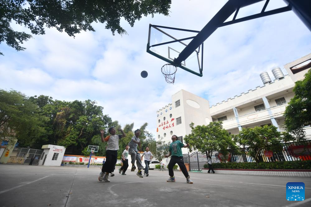 Students play basketball at a primary school in Changzhou District of Wuzhou City, south China's Guangxi Zhuang Autonomous Region, Nov. 14, 2024. Located on the Sizhou Island in Xijiang River and bestowed with rich intangible cultural heritage and beautiful natural scenery, Sizhou Village has become a famous tourism attraction.
