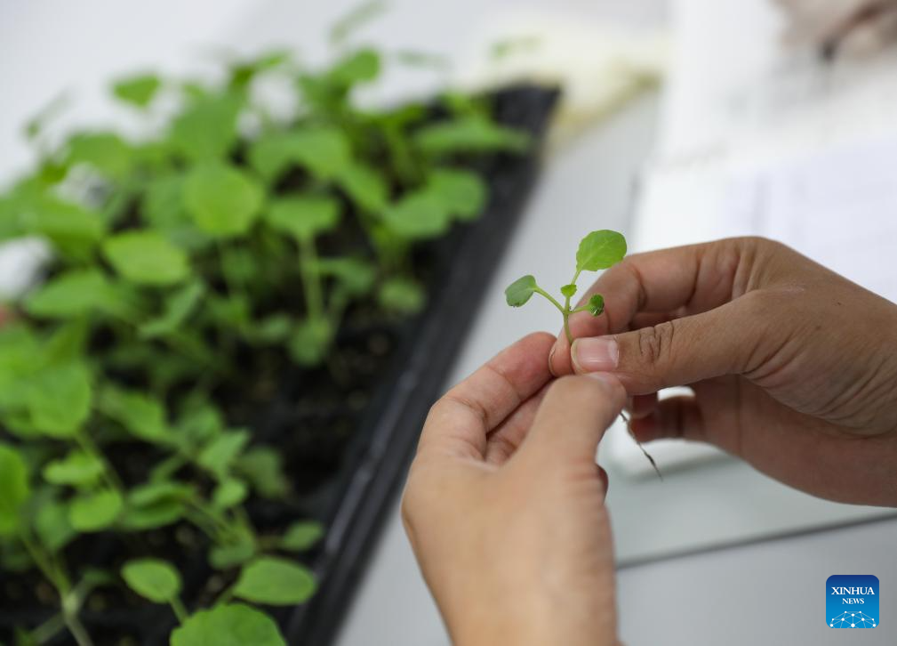 A researcher conducts traits test of oilseed rape seedlings at Yuelushan Laboratory in Changsha, central China's Hunan Province, Nov. 23, 2024. Hunan, one of the major agricultural provinces of China, has been making efforts to boost seed industry by implementing action plans, pooling the resources of agricultural science and technology innovation, and building up seed breeding laboratories. (Xinhua/Wang Jingqiang)