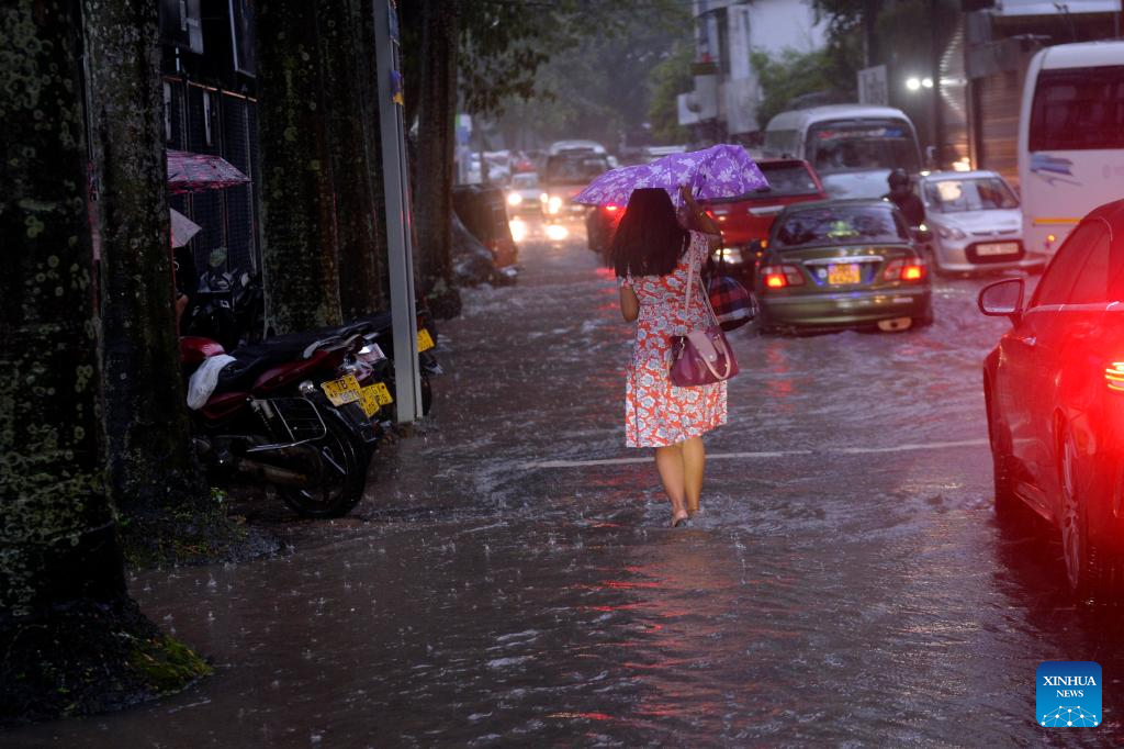 A pedestrian walks on a street in Colombo, Sri Lanka, Nov. 26, 2024. Sri Lanka's Department of Meteorology issued a red alert on Tuesday, warning that the deep depression in the Bay of Bengal is likely to intensify into a cyclonic storm on Wednesday. (Photo by Gayan Sameera/Xinhua)