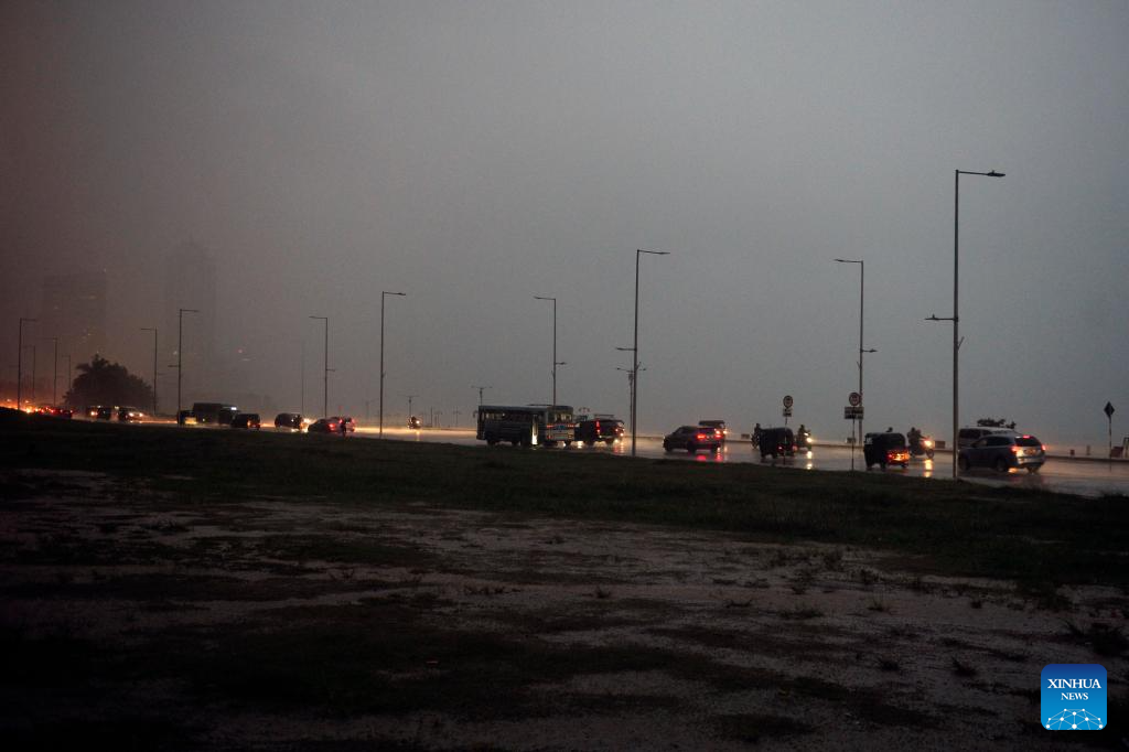 Vehicles move along a road in Colombo, Sri Lanka, Nov. 26, 2024. Sri Lanka's Department of Meteorology issued a red alert on Tuesday, warning that the deep depression in the Bay of Bengal is likely to intensify into a cyclonic storm on Wednesday. (Photo by Gayan Sameera/Xinhua)