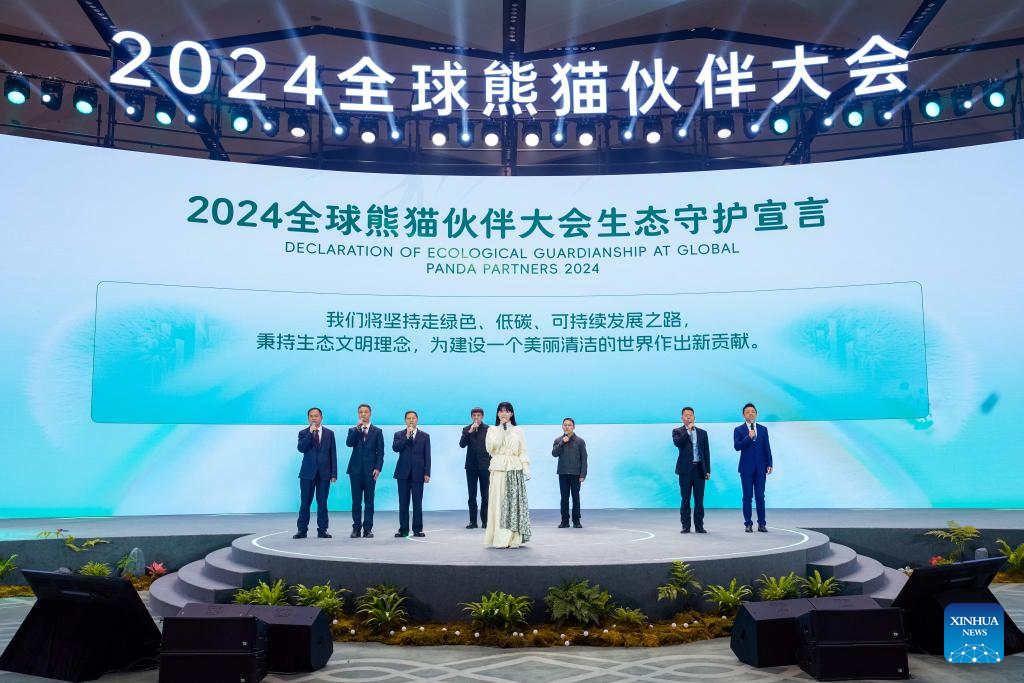 Guests participate in the Declaration of Ecological Guardianship at the Global Panda Partners 2024 conference in Chengdu, southwest China's Sichuan Province, Nov. 26, 2024.