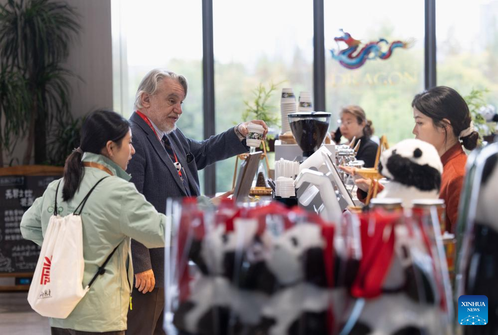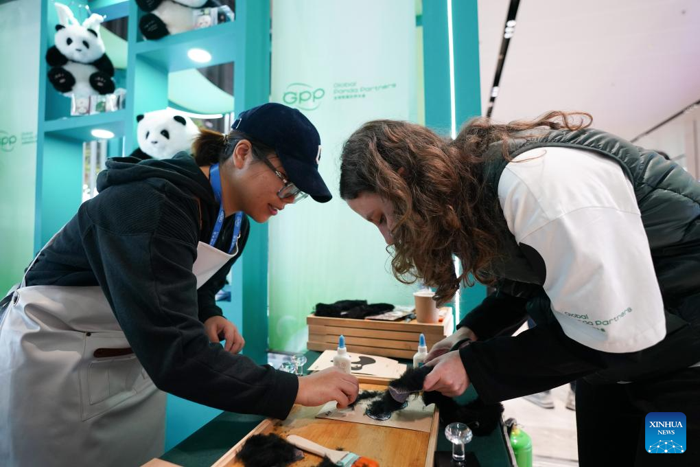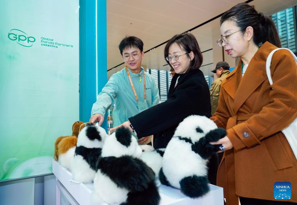 Guests look at creative cultural products themed on giant pandas during the Global Panda Partners 2024 conference in Chengdu, southwest China's Sichuan Province, Nov. 26, 2024. The event opened here on Tuesday with the theme "Harmonious Coexistence Between Man and Nature." (Xinhua/Jiang Hongjing)