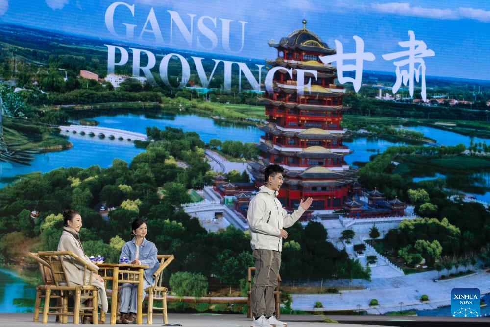 Young people from the provinces of Sichuan, Gansu and Shaanxi promote tourism resources during the Global Panda Partners 2024 conference in Chengdu, southwest China's Sichuan Province, Nov. 26, 2024. The event opened here on Tuesday with the theme "Harmonious Coexistence Between Man and Nature." (Xinhua/Jiang Hongjing)