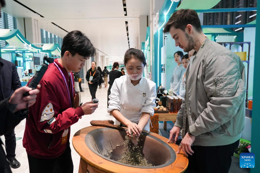 A foreign guest learns about the Ya'an tea-making technique during the Global Panda Partners 2024 conference in Chengdu, southwest China's Sichuan Province, Nov. 26, 2024. The event opened here on Tuesday with the theme "Harmonious Coexistence Between Man and Nature." (Xinhua/Xu Bingjie)