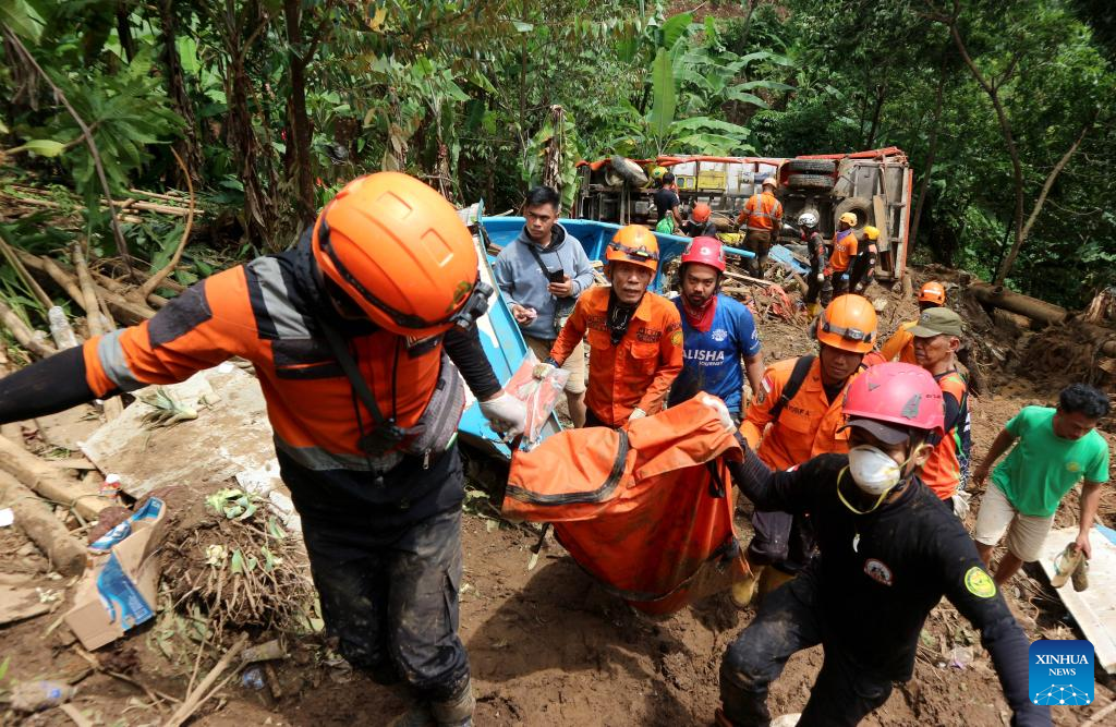 Rescuers transfer the body of a victim at the site of a landslide at Cisarakan village in Sukabumi Regency, West Java Province, Indonesia, Dec. 7, 2024. Five bodies have been recovered, and seven others are missing after flash floods and landslides destroyed hundreds of houses and infrastructure in Indonesia's West Java province, an official said on Friday. (Photo by Rangga Firmansyah/Xinhua)