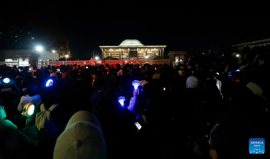 People attend a rally to call for the impeachment of South Korean President Yoon Suk-yeol near the National Assembly in Seoul, South Korea, Dec. 7, 2024. South Korea's parliament on Saturday failed to pass President Yoon Suk-yeol's impeachment motion as most of ruling People Power Party lawmakers refused to vote on it. (Photo by Jun Hyosang/Xinhua)