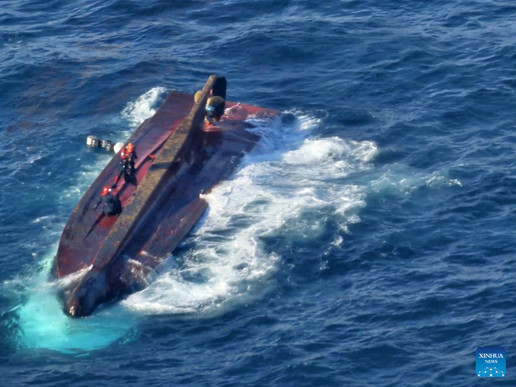 This photo taken on Dec. 9, 2024 shows a capsized fishing boat in waters off the coast of Gyeongju, South Korea. A fishing boat sank after colliding with a sand carrier off the coast of Gyeongju, southeast South Korea, leaving six of its crew members in cardiac arrest, Yonhap news agency reported on Monday, citing the South Korean Coast Guard. (Xinhua)