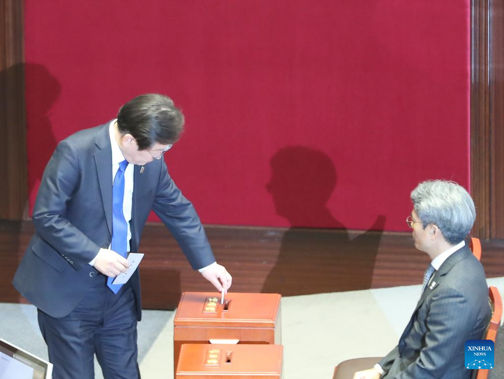 Lee Jae-myung (L), leader of South Korea's main opposition Democratic Party, casts his vote on the impeachment motion against President Yoon Suk-yeol in Seoul, South Korea, Dec. 14, 2024. South Korea's parliament voted Saturday to impeach President Yoon Suk-yeol over his martial law declaration, after the first impeachment motion was dropped a week earlier as the ruling party lawmakers boycotted it.