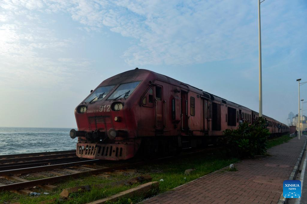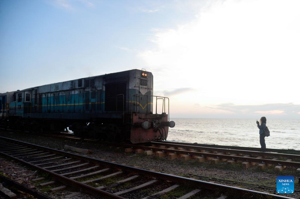 This photo taken on Dec. 23, 2024 shows a train by the sea in Colombo, Sri Lanka.