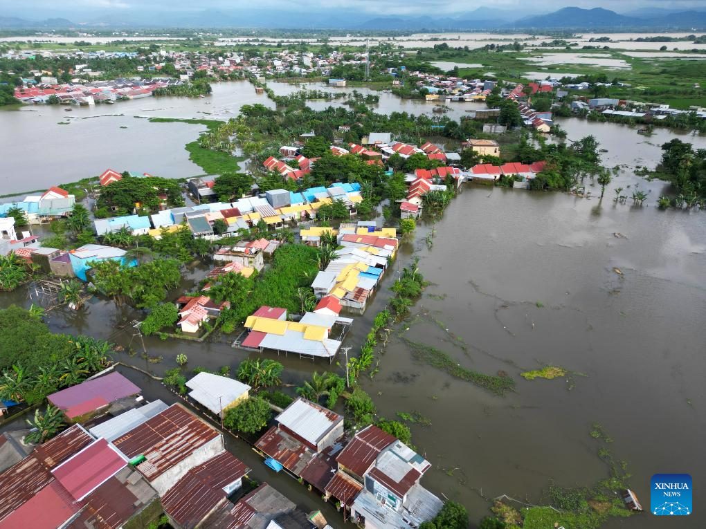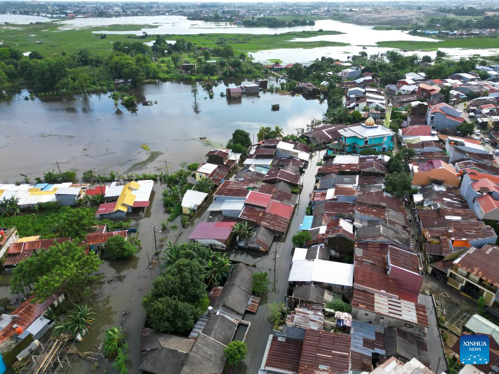 An aerial drone photo taken on Dec. 24, 2024 shows a flooded residential area after heavy rain hit Makassar, South Sulawesi Province, Indonesia. Floods and landslides have been hitting several regions in the Southeast Asian archipelago in the past week. (Photo by Niaz Sharief/Xinhua)