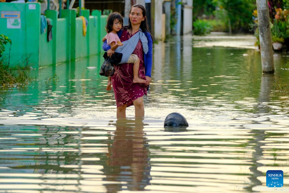 A woman holding a girl walks through flood water after heavy rain hit Makassar, South Sulawesi Province, Indonesia, on Dec. 24, 2024. Floods and landslides have been hitting several regions in the Southeast Asian archipelago in the past week. (Photo by Niaz Sharief/Xinhua)