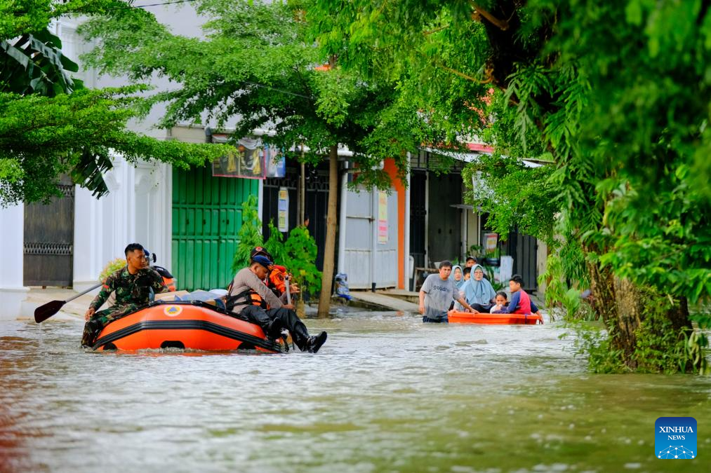 People ride rubber boats in flood water after heavy rain hit Makassar, South Sulawesi Province, Indonesia, on Dec. 24, 2024. Floods and landslides have been hitting several regions in the Southeast Asian archipelago in the past week. (Photo by Niaz Sharief/Xinhua)