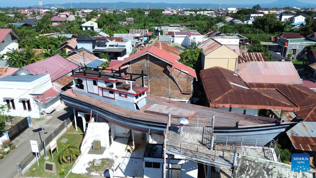 An aerial drone photo taken on Dec. 26, 2024 shows a boat washed ashore by the 2004 Indian Ocean tsunami in Aceh Province, Indonesia. Residents of Indonesia's Aceh province in the northern tip of Sumatra Island paid tribute on Thursday to relatives, family members, and friends who lost their lives during the tsunami on Dec. 26, 2004. (Photo by Fachrul Reza/Xinhua)